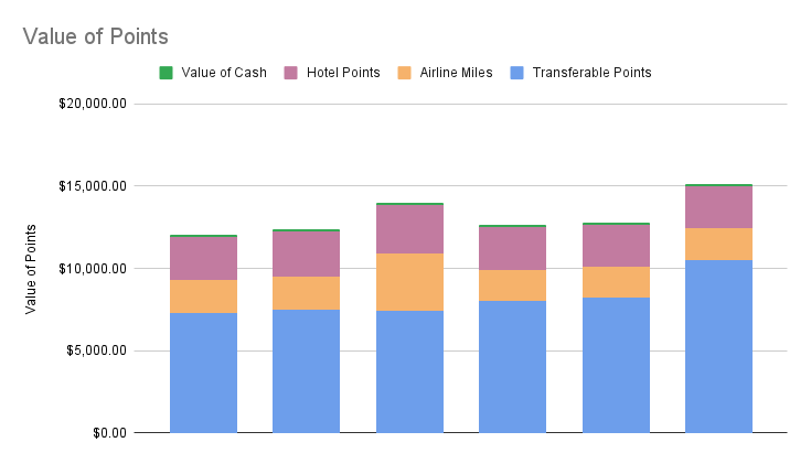 Using the point valuations published by The Points Guy, the total value of all of those points and miles is $12,700. That is down from $14,000 last month. Since we pretty much have Spring Break booked and I don’t have any plans after that, we are going to be in complete point accumulation mode. By the time we get around to booking the next trip, we should be sitting on a lot of points.