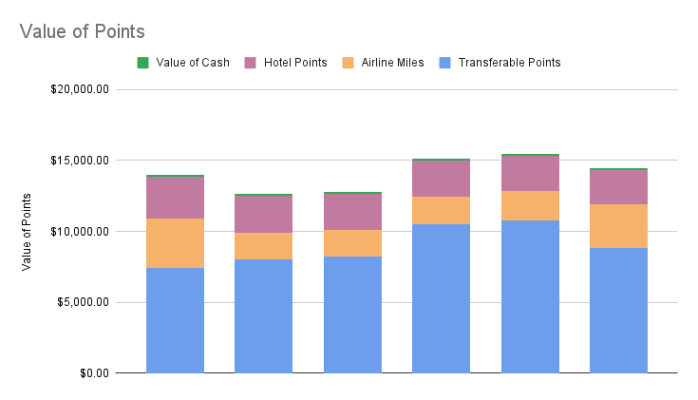 We spent around $2,500 on cards not earning a bonus, earning less than 5% return on that spend. That’s below where I want to be. I want to shift as much of this to the Bilt Palladium card over time, since that has solid earnings on all spend. I’m going to continue to keep utilities on the Wyndham Business Earner card since it earns 5X on utilities, and I’ll keep our phone bill and streaming services on the Ink Cash since it earns 5X on that spending. But other than that, most of this would be better spent on the Bilt Palladium Card.