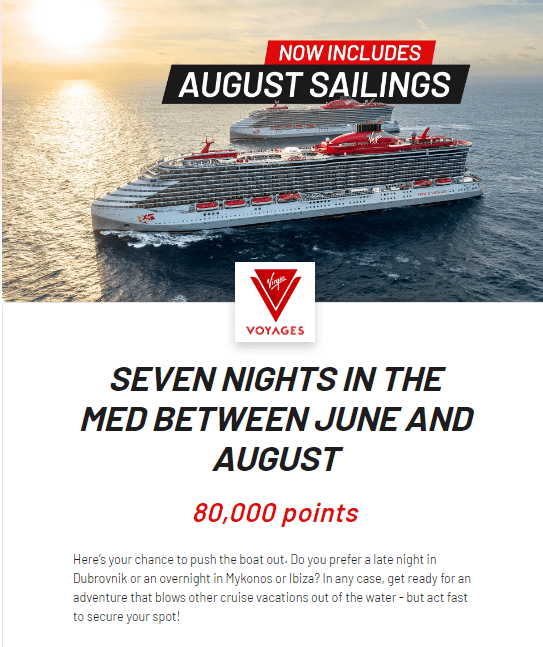 Ok, this one, honestly, I don’t even believe this exists. Bear with me on this, again I have precisely 0 Virgin miles. Virgin has a ton of great transfer partners, similar to Flying Blue. They have Chase Ultimate Rewards, Citi Thank You points, Capital One and Amex all at 1:1 as well as Marriott Bonvoy at 3:1. In this case, it would be similar to Flying Blue with us able to covert our points to 375,000 Virgin miles, however, they also right now are offering a 30% transfer bonus from Chase, as described in this post from One Mile at a Time. With the transfer bonus, we would have access to 464,500 Virgin miles if we did complete transfers from Citi, Chase, Capital One and Marriott. Here is the deal from Virgin that would be the most intriguing to me – Virgin cruises occasionally runs sales on cruises where you can get a one week cruise for 2 people for 80,000 points. The latest special, as described by Upgraded Points, has 4 different 7 day itineraries for Mediterranean cruises to choose from. With the available points, we could cruise for 5 weeks and have points to spare. That’s just silly.