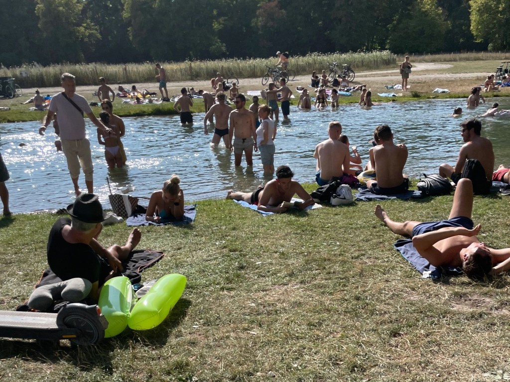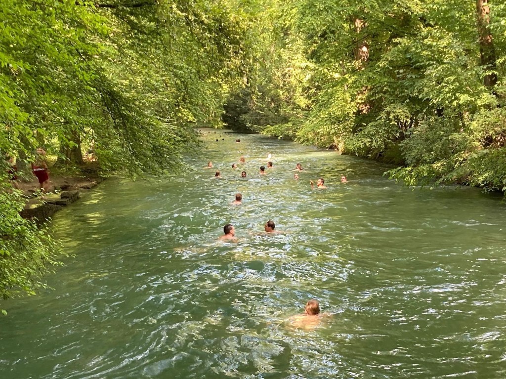 Swimming, wading and sunbathing in the Schwabinger Bach, a calmer offshoot of the Eisbach in the Englischer Garten