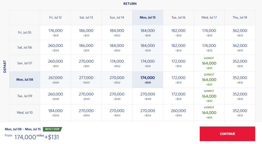 The lowest available round trip is 164,000 miles. That would essentially eat up all of the points earned from the Amex Gold with one round trip ticket when the points are transferred to Delta. That’s not great.