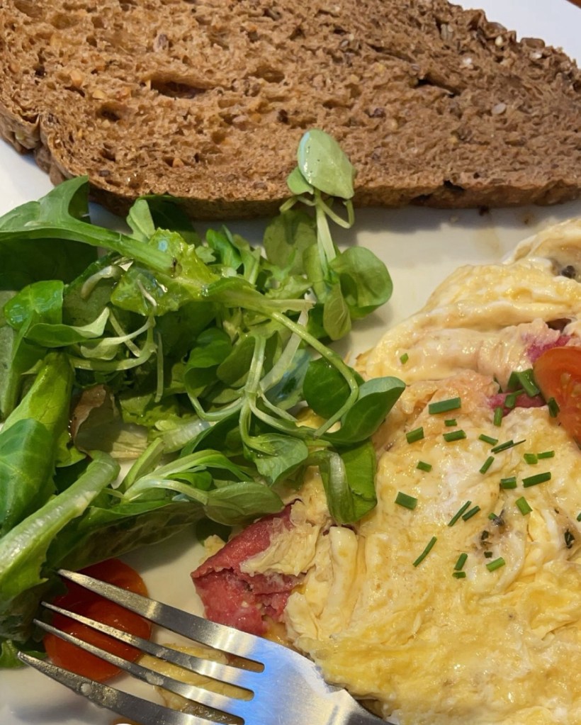 The place we stopped at was a small but very busy breakfast restaurant called Omelegg. Seating there was a bit of a challenge. We ended up having to sit next to each other at a booth because the other side had a bench that was being used by a different table. It was a little awkward, but it was fine.