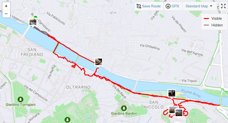 Our Airbnb was located south of the Firenze Santa Maria Novella train station and just a block off of the Arno river. This meant that all I had to do was take a right on the first street, and then jump on the sidewalk that runs parallel to the Arno River.