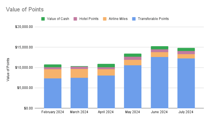 Since there were no signup bonuses or referral bonuses to hit this month, we ended up with a total of 287,000 Membership Reward Points, 207,000 Ultimate Reward points, 82,300 Capital One Venture miles, 64,500 American Airlines miles, 39,400 Citi Thank You points, 36,300 Wyndham points, 34,800 Marriott Bonvoy points, 5,100 Delta miles, 2,300 Hyatt points and over $800 in cash back. Using the Points Guy’s valuations, the value of all of the points, miles and cash back is a little over $14,850.