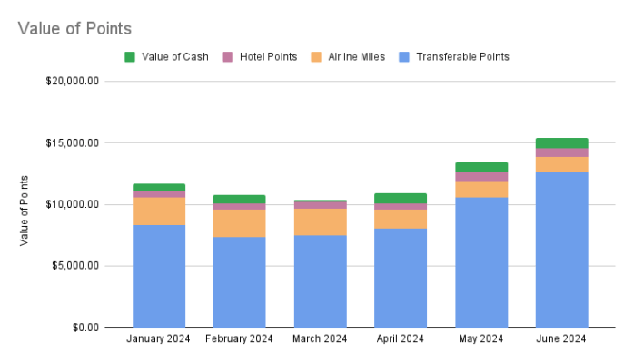 Wow, another big month of accumulating points as we continue to collect Membership Reward points from the three American Express cards that we signed up for this year. Last month Jenn earned her 130,000 point bonus on her Amex Business Gold card. This month, I earned my 75,000 point signup bonus on my Amex Gold Card. These bonuses in the last two months were the main reason why our total points valuations jumped from over $10,500 two months ago to over $15,000 now.