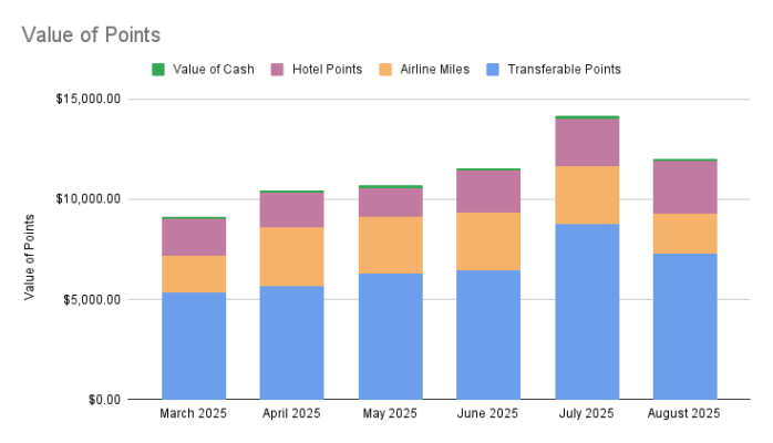 According to the Points Guy’s valuations, the grand total of those points, miles, and cash back is a little less than $11,600. That is an increase of around $800 from the previous month, as our point totals finally start to recover from the massive amount of point redemptions we made at the end of last year and the beginning of this year. Of course, the most important thing is that we get to enjoy another wonderful vacation.