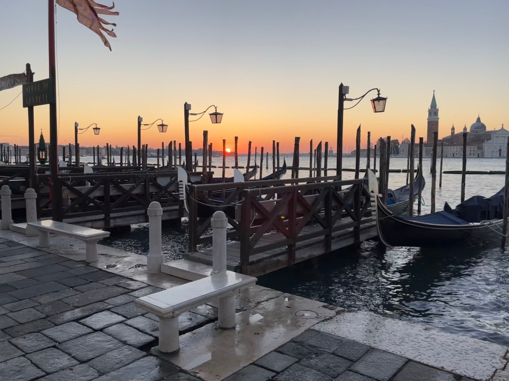I then ran through the pillars that mark the edge of the Piazza San Marco and turned left along the water. Right outside of the Piazza is a series of docks for gondolas that aren’t yet in service.