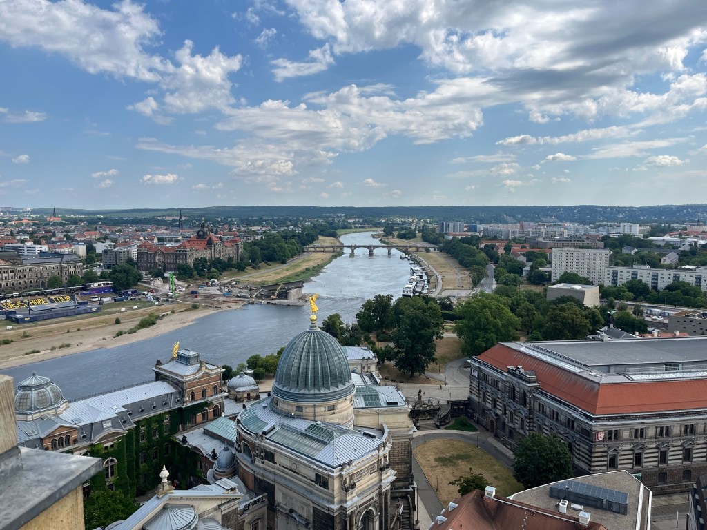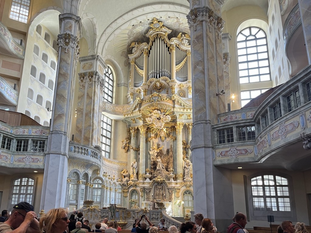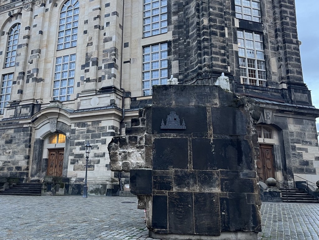 We ended our visit to Frauenkirche, standing in front of the last remaining piece of rubble from what was the pile that lay in Dresden for decades. It was a large piece of the dome recovered from the pile, placed as a monument with a plaque containing the account of a survivor of the firebombing.