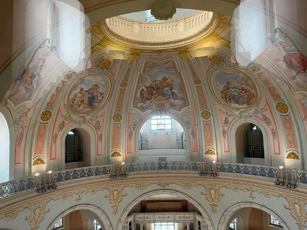 A pride flag hangs from a balcony of an art museum that faces the Frauenkirche