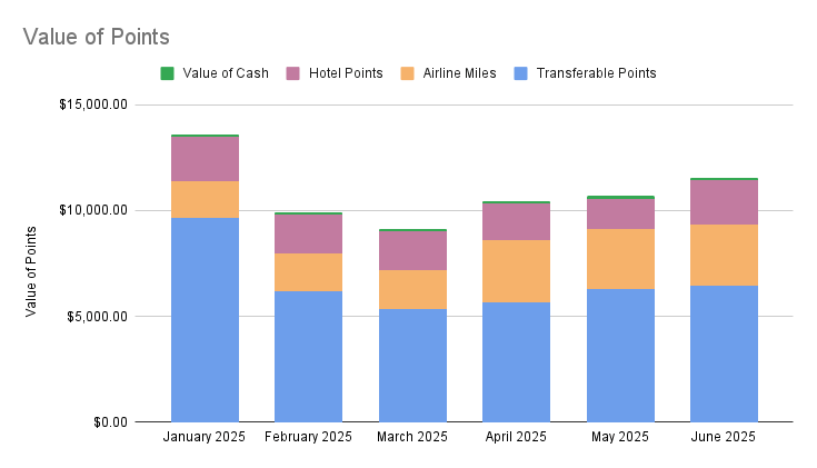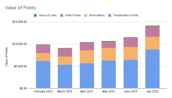 Using the point valuations published by The Points Guy, the total value of all of those points and miles is $12,700. That is down from $14,000 last month. Since we pretty much have Spring Break booked and I don’t have any plans after that, we are going to be in complete point accumulation mode. By the time we get around to booking the next trip, we should be sitting on a lot of points.